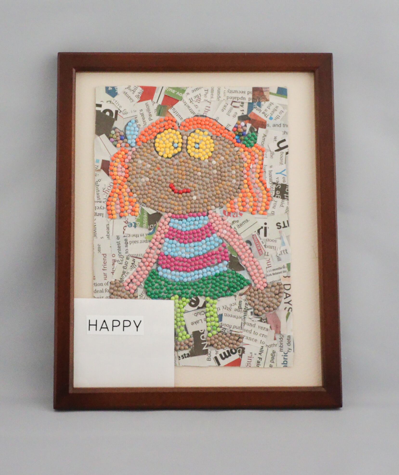 ダイヤモンド刺繍と英字新聞を組み合わせた作品です。根気の必要なダイヤモンド刺繍は一粒一粒をピンでつまんで貼っていくという作業をしています。また配色を考えることや職員に質問する、自分の考えを伝えるということを作業しながら学びます。画像のような簡易の額のままお届けするのも別途費用が必要ですが額装してお届けすることも可能です。