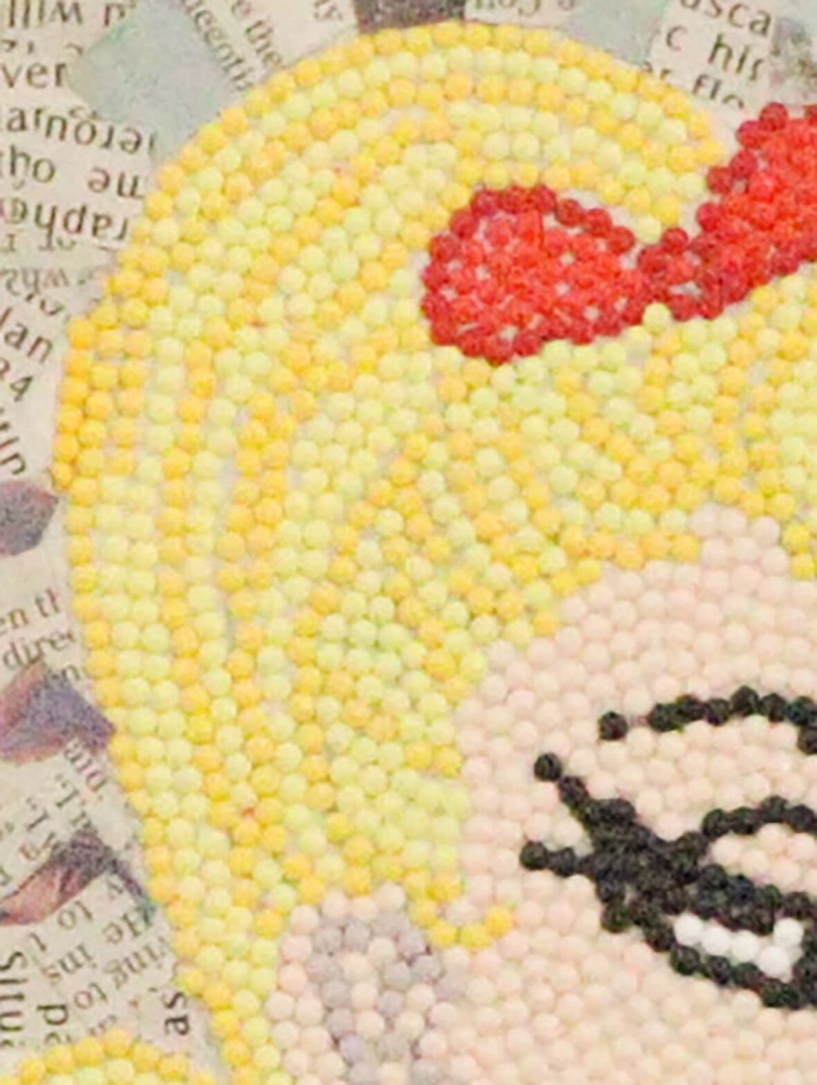ダイヤモンド刺繍と英字新聞を組み合わせた作品です。根気の必要なダイヤモンド刺繍は一粒一粒をピンでつまんで貼っていくという作業をしています。また配色を考えることや職員に質問する、自分の考えを伝えるということを作業しながら学びます。画像のような簡易の額のままお届けするのも別途費用が必要ですが額装してお届けすることも可能です。