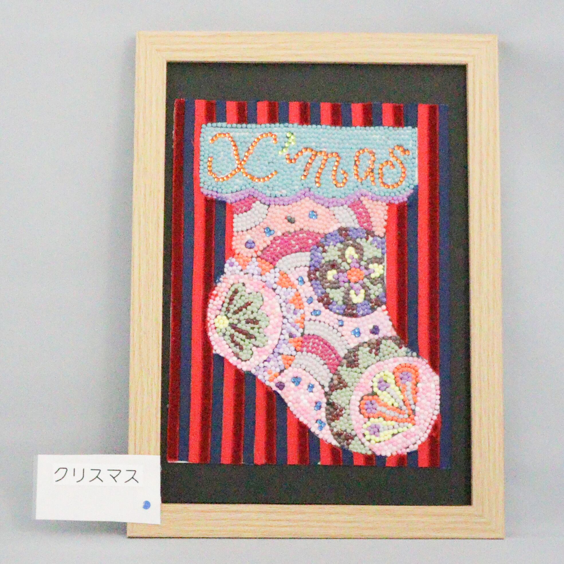 ダイヤモンド刺繍作品です。根気の必要なダイヤモンド刺繍は一粒一粒をピンでつまんで貼っていくという作業をしています。また配色を考えることや職員に質問する、自分の考えを伝えるということを作業しながら学びます。画像のような簡易の額のままお届けするのも別途費用が必要ですが額装してお届けすることも可能です。