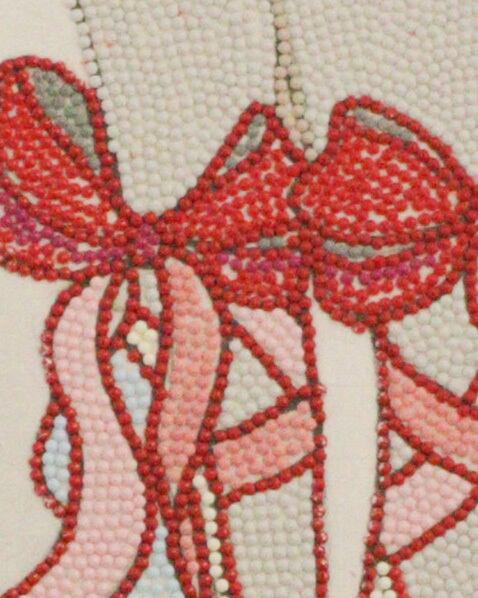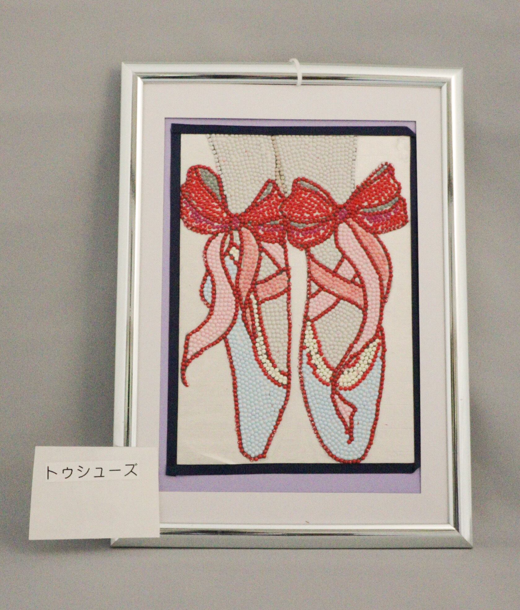 ダイヤモンド刺繍の作品です。根気の必要なダイヤモンド刺繍は一粒一粒をピンでつまんで貼っていくという作業をしています。また配色を考えることや職員に質問する、自分の考えを伝えるということを作業しながら学びます。画像のような簡易の額のままお届けするのも別途費用が必要ですが額装してお届けすることも可能です。